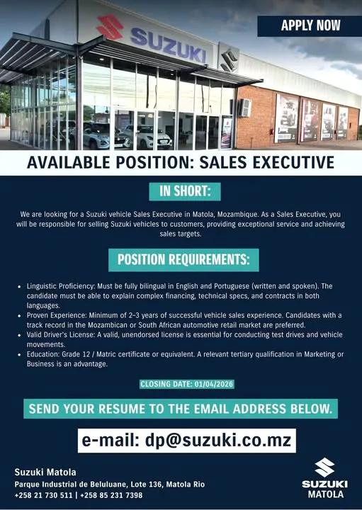 Estamos à procura de um(a) Executivo(a) de Vendas dinâmico(a) para se juntar à nossa equipe no showroom de Matola. Se você é bilíngue (inglês/português), possui experiência comprovada em vendas automotivas e paixão pela marca Suzuki, queremos conhecer você!